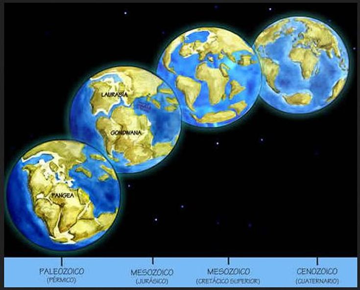 Al final del Paleozoico y principios del Mesozoico las diferentes masas de tierra se unieron en un supercontinente llamado Pangea. Se fracturó hace 200 millones de años, y los continentes se fueron separando hasta alcanzar la posición con la que los conocemos a día de hoy.