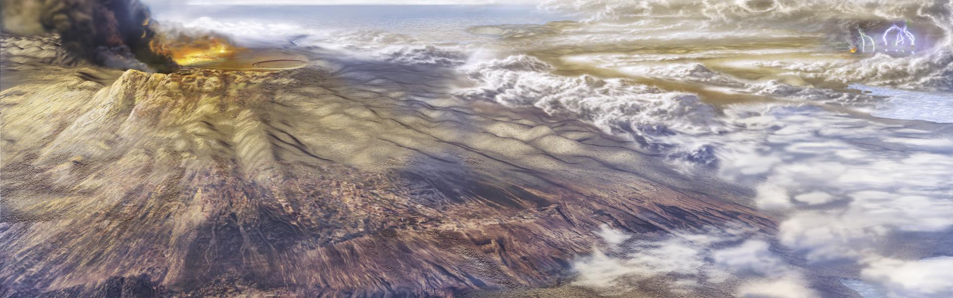 Al evaporarse de la superficie, el vapor de agua ascendió en cantidades inmensas y se unió al dióxido de carbono de la atmósfera primigenia, formando nubes espesas, que lo cubrieron todo. Esta condensación desencadenaría el mayor diluvio que ha sufrido la Tierra. Las tormentas azotaban los cielos y la lluvia comenzó a caer sobre la superficie rocosa. Y siguió lloviendo; llovió durante millones, y millones, y millones de años. El resultado fue un mundo acuático. Más del 90% de la superficie de la Tierra se había convertido en un inmenso océano. Se formaron pequeñas islas volcánicas en los mares.