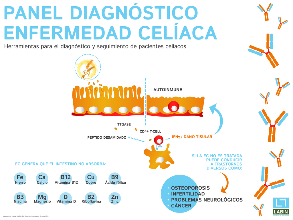 – En la edad adulta: diarrea; apatía; irritabilidad; astenia; inapetencia; pérdida de peso; dermatitis herpetiforme; anemia ferropénica; osteoporosis; artritis; colon irritable; abortos; infertilidad; menopausia precoz; epilepsia; cáncer digestivo; transaminasas altas en el hígado (hipertransaminemia); o funcionamiento incorrecto de los nervios periféricos (neuropatías periféricas).