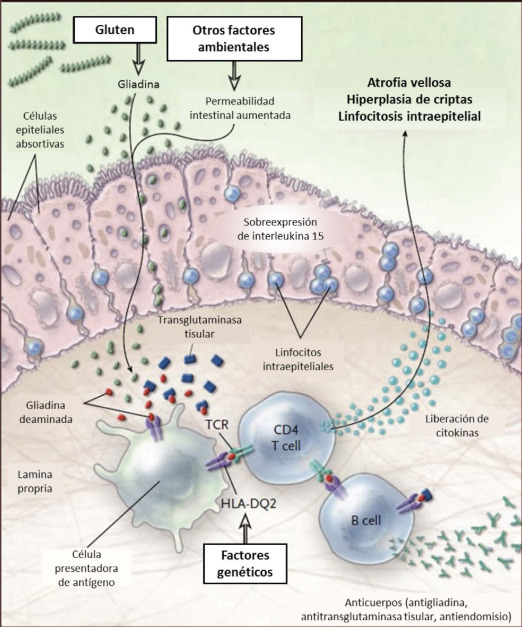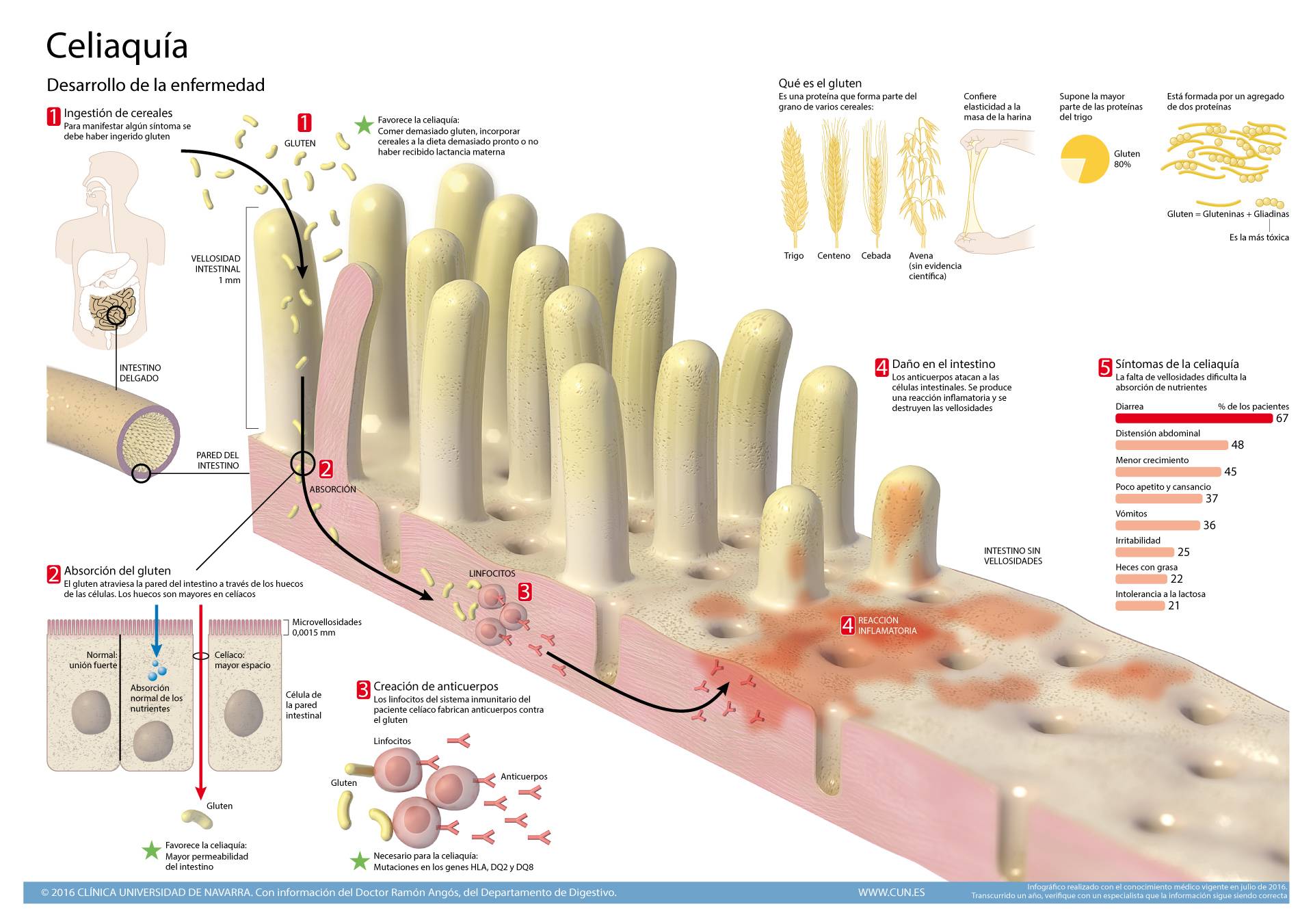 La causa exacta de la enfermedad celiaca se desconoce, pero sí se ha concluido que tiene una base genética ya que en múltiples ocasiones hay más de un miembro de una familia que la padecen. La principal consecuencia de la celiaquía es que la reacción a la ingesta de gluten desencadena una respuesta inmunitaria en el intestino delgado que, con el tiempo, ve dañadas las vellosidades que lo revisten y que se encargan de la absorción de nutrientes.