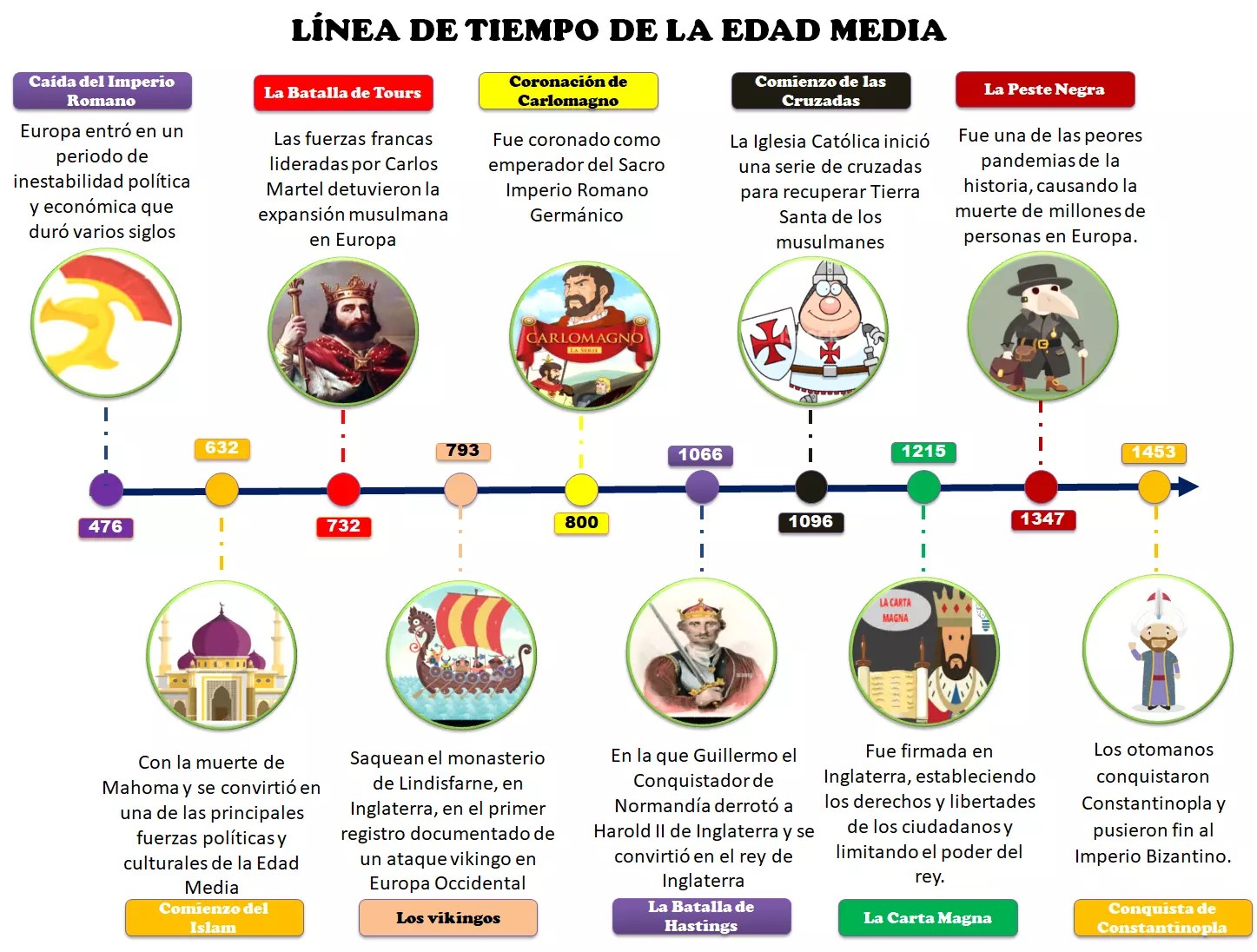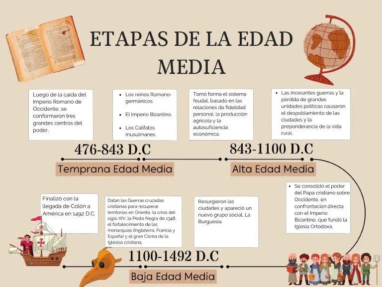 La Edad Media es el período de la historia comprendido entre la caída del Imperio Romano de Occidente en 476 d. C., y la llegada de los españoles a América, en 1492. Este periodo histórico se encuentra entre laEdad Antigua y laEdad Moderna.